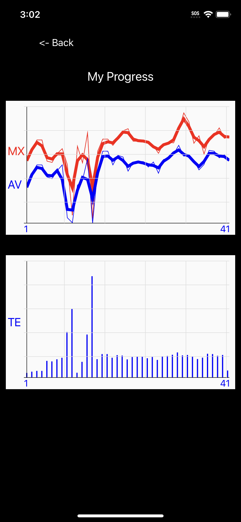 - Click the "My Progress" button and see timely parameters of your Average (AV), Max (MX) and Total (TE) session Efforts. The Efforts are measured activity is quantized into E-units (E) which are the 'Efforts' per a defined time slot. You may ignore the thin lines with AV & MX. Horizontal axis represents consecutive session numbers.