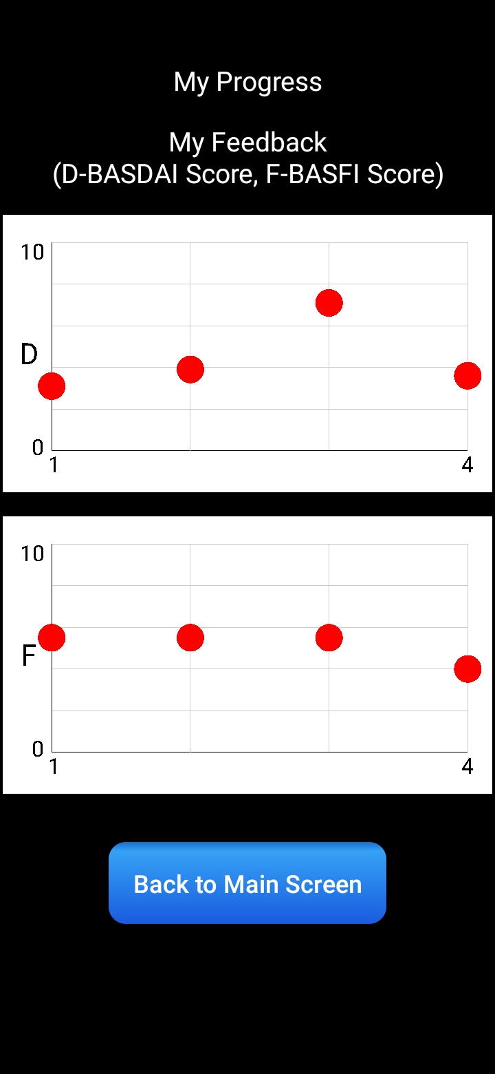 - Answer all questions. There will be 3 consecutive screens of BASDAI and BASFI questionnaires (pic BASDAI, BASFI_1, BASFI_2).
